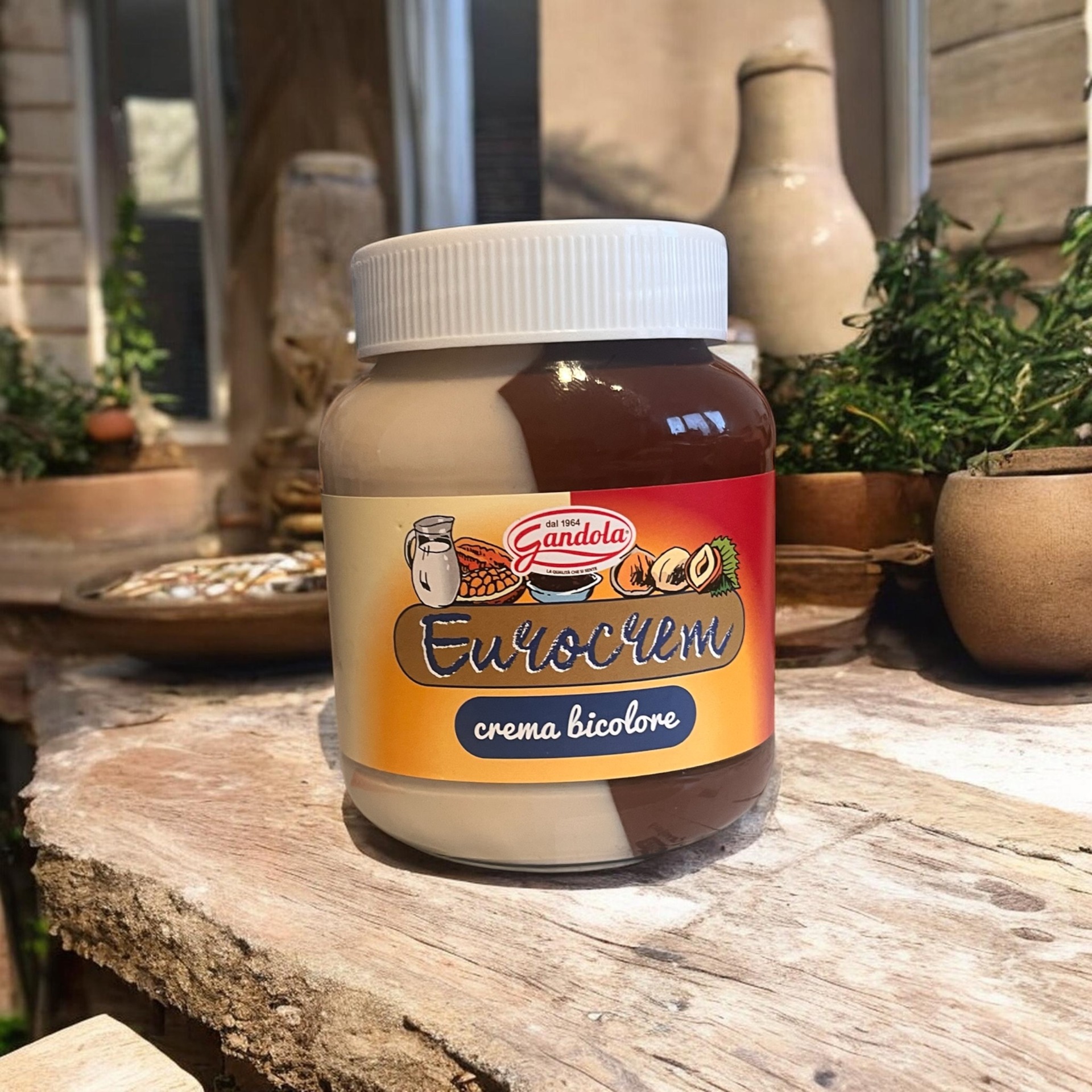 Gandola Crema Bicolore (400 g) je klasická talianska nátierka, ktorá kombinuje dve obľúbené chute – tmavú kakaovú a svetlú mliečno-orieškovú. Je známa svojou jemnou, ľahko roztierateľnou textúrou a priaznivou cenou.