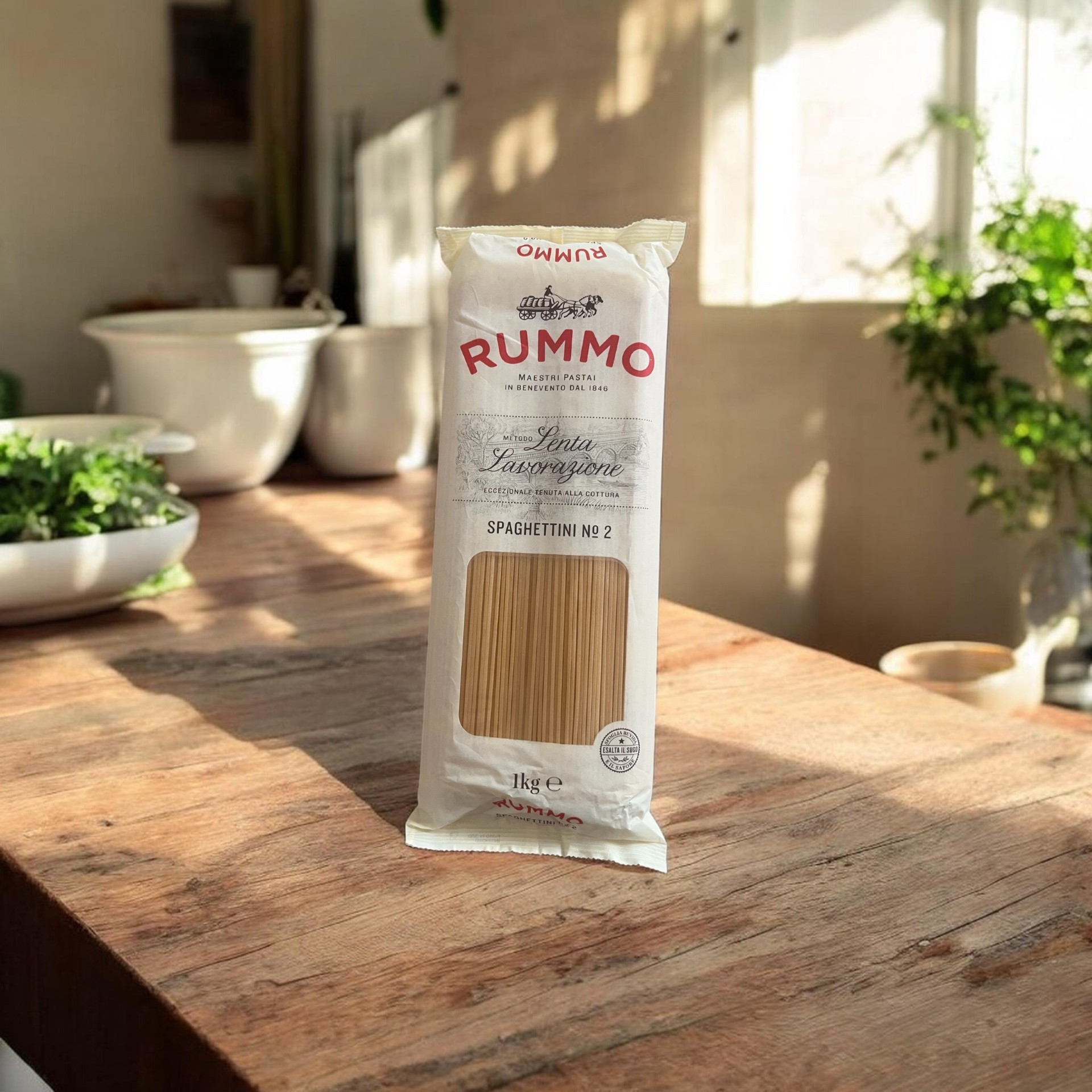 Rummo Spaghettini n. 2 (1 kg) sú prémiové talianske cestoviny, ktoré sú o niečo tenšie než klasické špagety (n. 3 alebo n. 5). Vďaka patentovanej metóde Lenta Lavorazione (pomalé spracovanie) si zachovávajú výnimočnú pružnosť a zostávajú pevné „al dente“ aj po uvarení.,