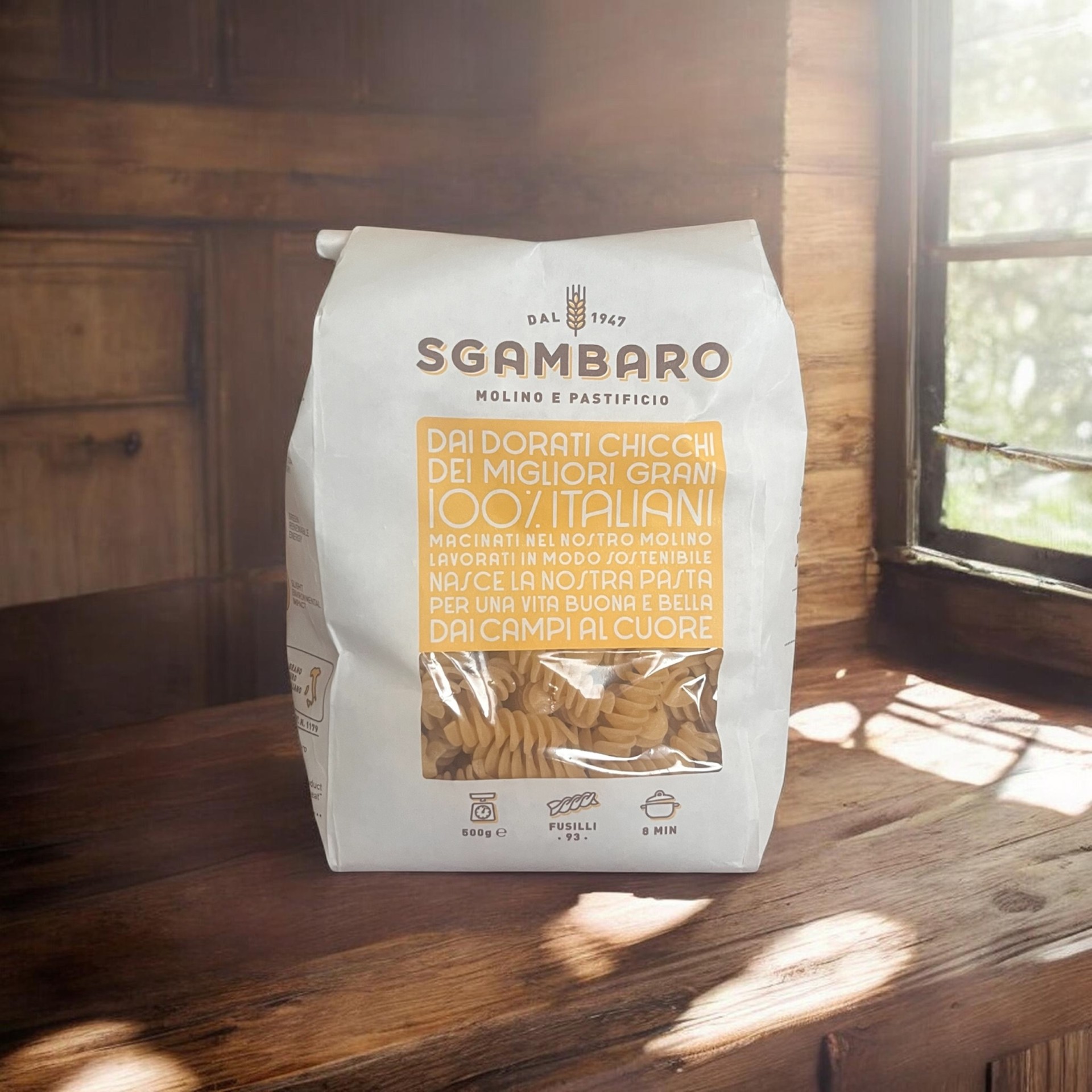 Sgambaro Fusilli č. 93 sú prémiové talianske cestoviny, ktoré sa vyrábajú v niekoľkých variantoch z výberových obilnín, ako je tvrdá pšenica (semolina), špalda jednozrnná alebo pšenica Khorasan. Tieto cestoviny sa vyznačujú spracovaním pomocou bronzových matríc, čo im dodáva drsný povrch ideálny na zachytenie omáčok.