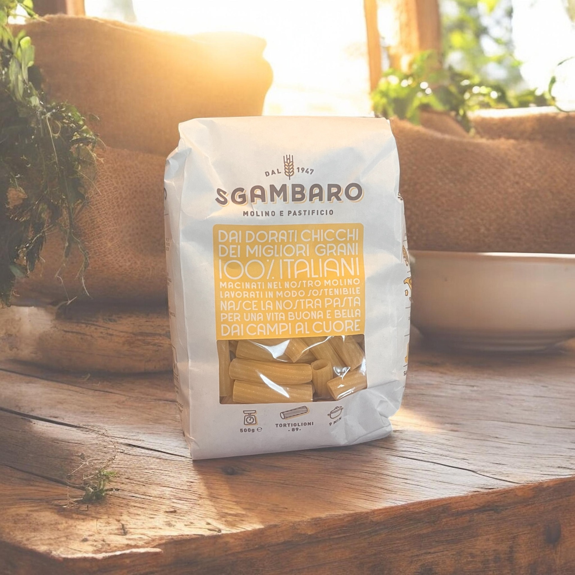 Sgambaro Tortiglioni je prémiová talianska cestovina známa svojou vysokou kvalitou, vyrábaná zo 100 % talianskej pšenice. Vyznačuje sa špirálovitým tvarom s výraznými vonkajšími drážkami, ktoré sú ideálne na zachytenie hustých omáčok.