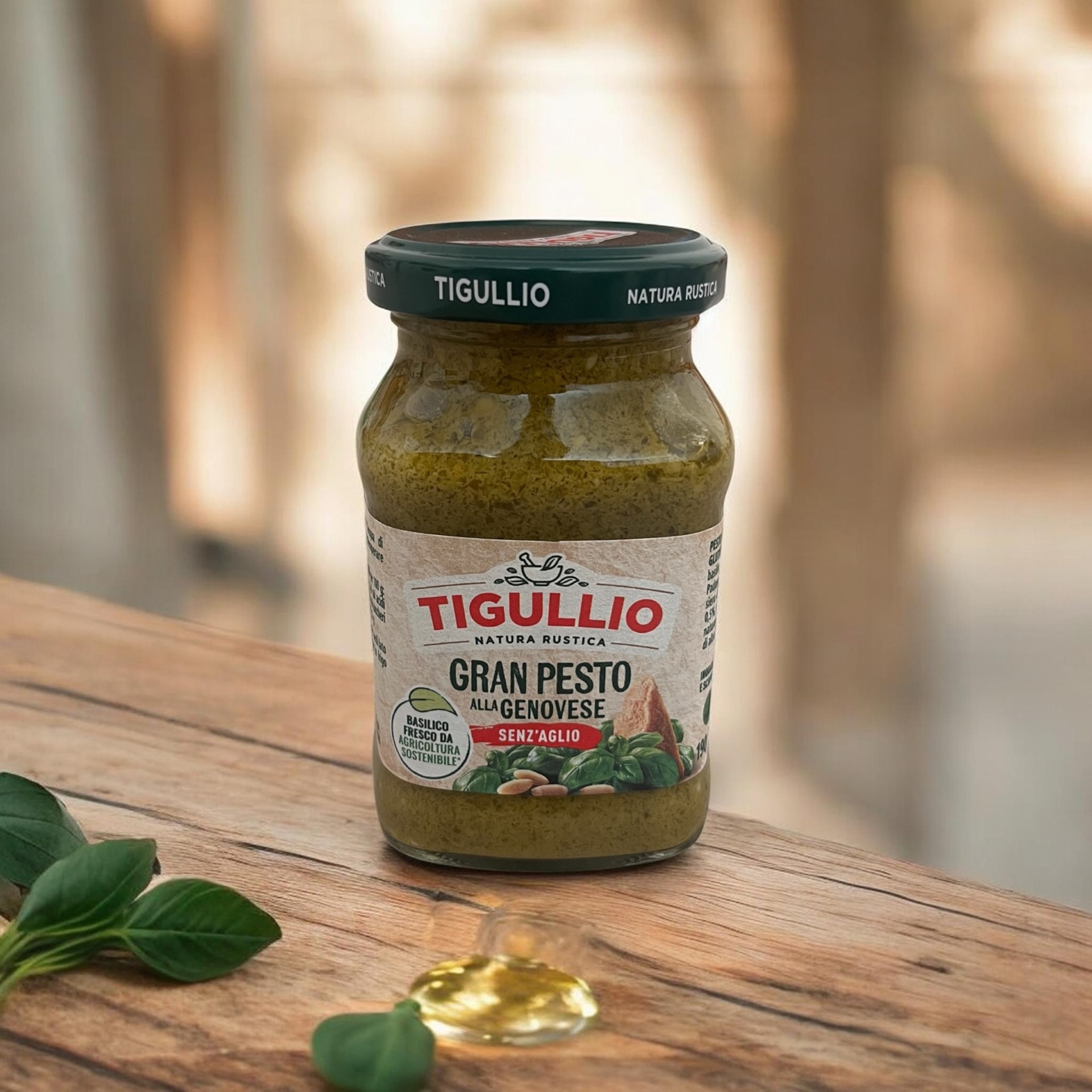 Tigullio Gran Pesto alla Genovese senza Aglio (190 g) je talianske bazalkové pesto určené pre tých, ktorí preferujú jemnejšiu chuť bez cesnaku. Výrobcom je značka Star Tigullio, ktorá sa zameriava na tradičné receptúry z Ligúrie.